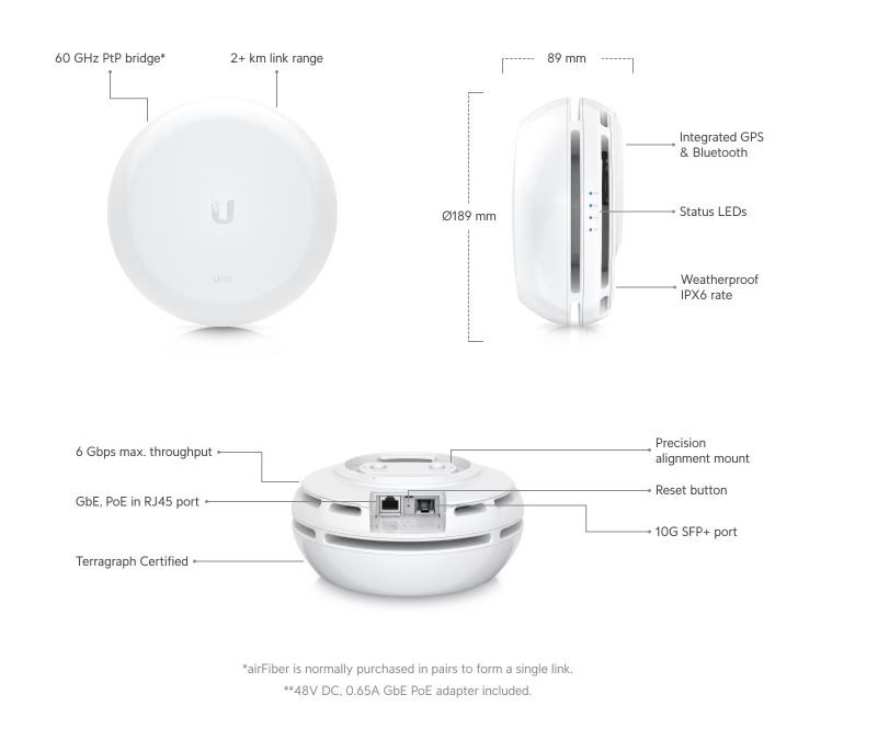 UBNT AF60 HD - UBNT aiFiber 60 HD; 1,6 GHz Arm Cortex A72 İşlemci, 2 GB DDR4 RAM, sinyal kirliliğinden etkilenmeyen 60GHz ana link bağlantı radyo kartı, 35 dBi Dahili DISH Anten yapısı, gerçek zamanlı paket iletişim senkronizasyonu için kullanılan dahili GPS modülü, geliştirilmiş dalgalanma koruması (Surge Protection) sunan Gigabit Ethernet arayüzü, yüksek hızlarda veri iletişimine olanak sağlayan 10G SFP+ Fiber Bağlantı Portu, Kurulum ve yapılandırma işlemlerinizi kolaylaştırmak için eklenmiş Bluetooth ile 2 KM uzaklığa kadar channel bonding teknolojisi kullanıldığında 3.8Gbps/6Gbps data aktarım hızlarına ihtiyaç duyulan maliyet odaklı Noktadan Noktaya (PtP) haberleşme altyapılarında kullanılabilen ürün, kablosuz ağ alyapı projelerinize performanslı, güncel ve bütçe dostu bir çözüm sunmaktadır. Tescilli UBNT InnerFeed™ teknolojisi, aiFiber ürün ailesinde Anten ile Radyo kart arasında bağlantı kablolarını ortadan kaldırarak, geleneksel bağlantı tiplerinde yaşanan performans kaybını ortadan kaldırmaktadır. UBNT airFiber 60 LR Modüler tasarımı ile kurulum ve kurulum sonrası ayar/bakım işlemlerinizi hızlıca halledilebilirsiniz.